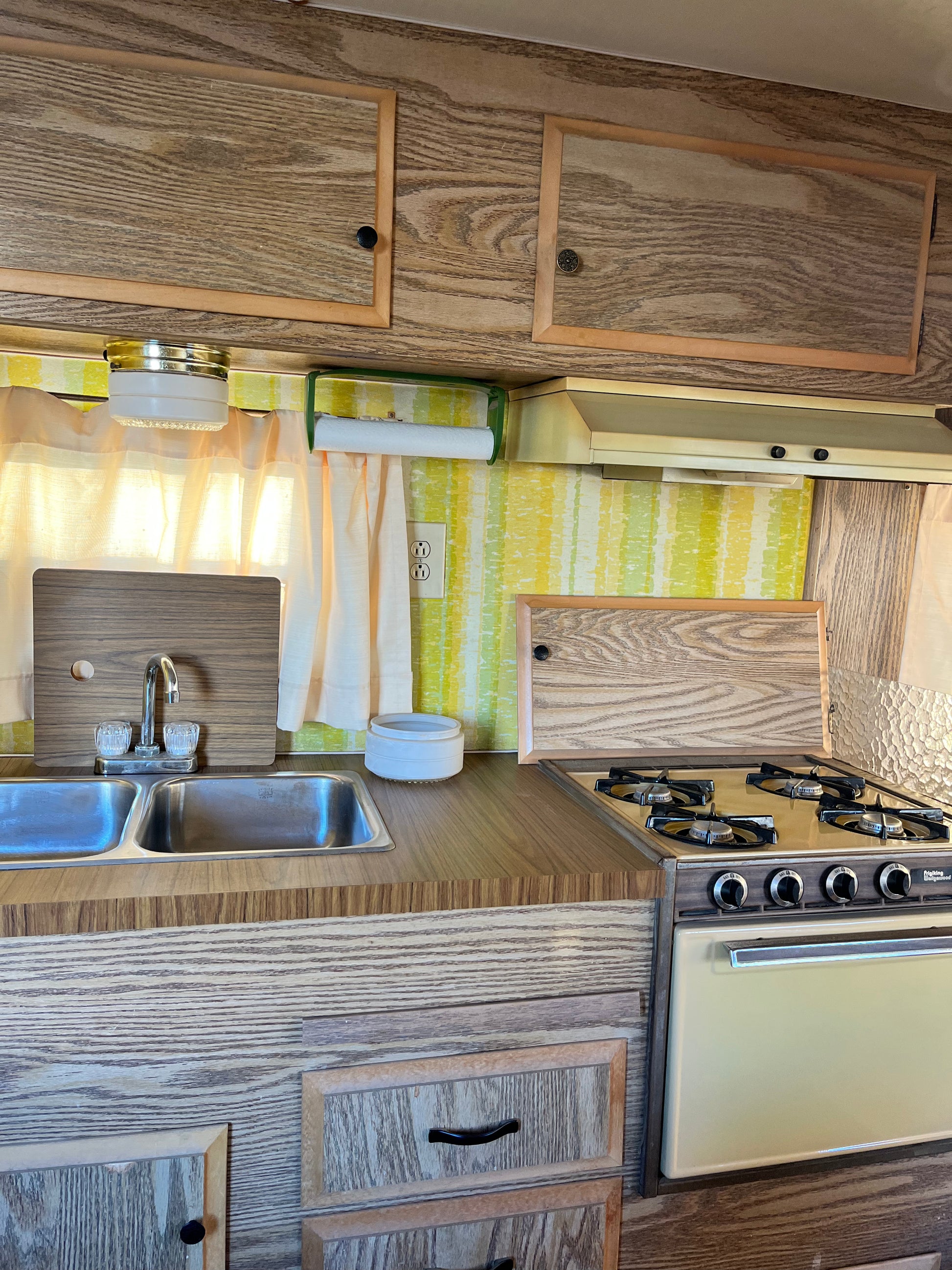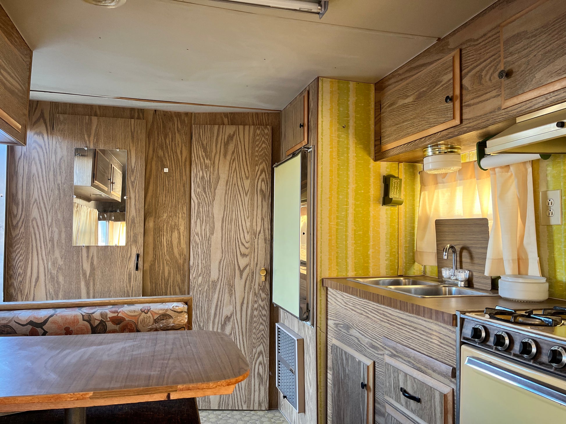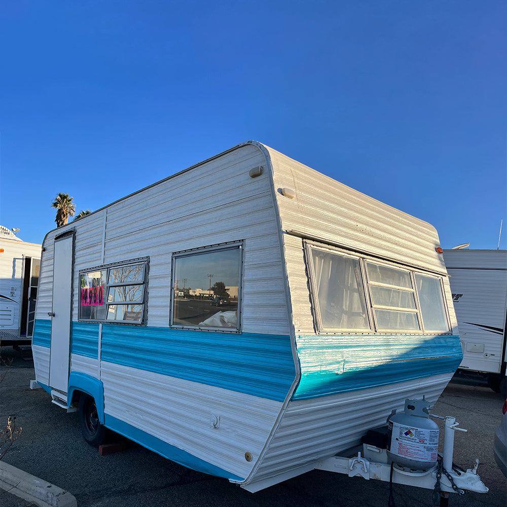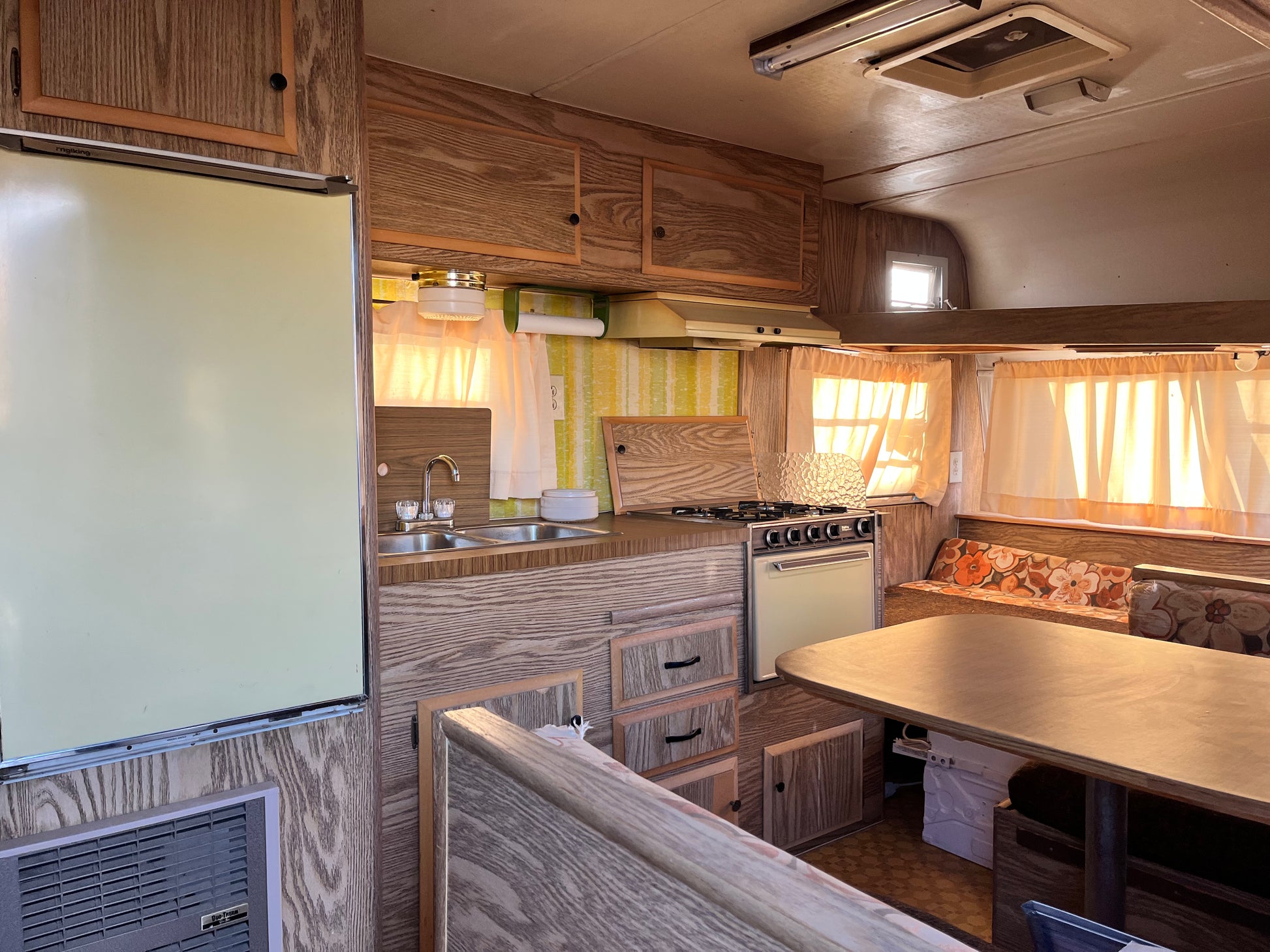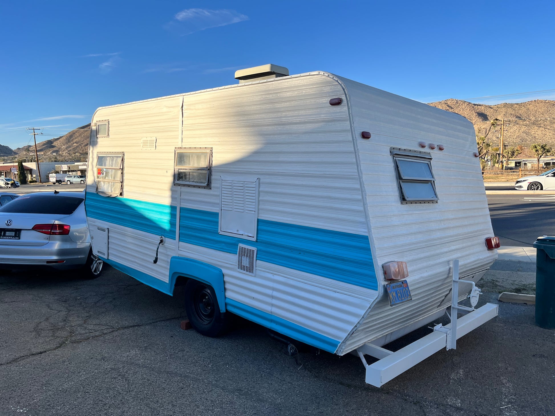 1973 Sun blazer vintage travel trailer. 18 foot long. Has a clean title and current registration. Everything works. It has a full bathroom with a shower, toilet and sink and a full kitchen with oven stove and sink. The front area sleeps two people the couch folds down to a bed, and the dinette sleeps one person the table turns into a bed. The trailer is in good condition with new tires and rims and ready to take camping .